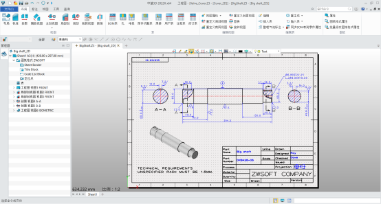 与ZWCAD协同 | 在中望3D生成工程图后,能够直接在中望3D中启动ZWCAD来打开该工程图进行进一步的标注和完善,实现三维二维数据的无缝对接。 |
